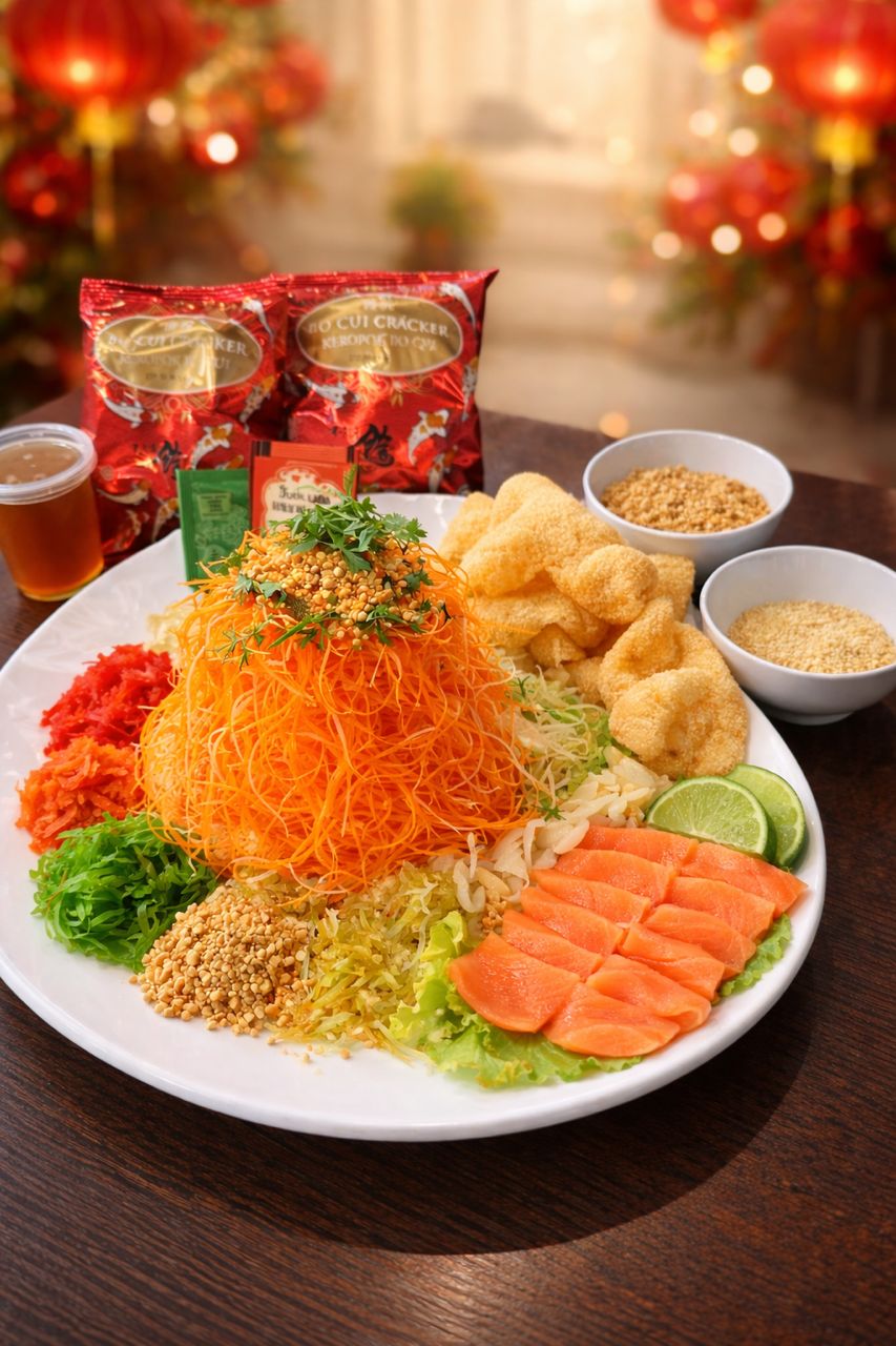 随着一盘色彩缤纷的【七彩三文鱼鱼生】端上桌,大家纷纷举起长筷,一边将食材高高捞起,一边齐声高喊:“捞起!捞起!捞到风生水起!”